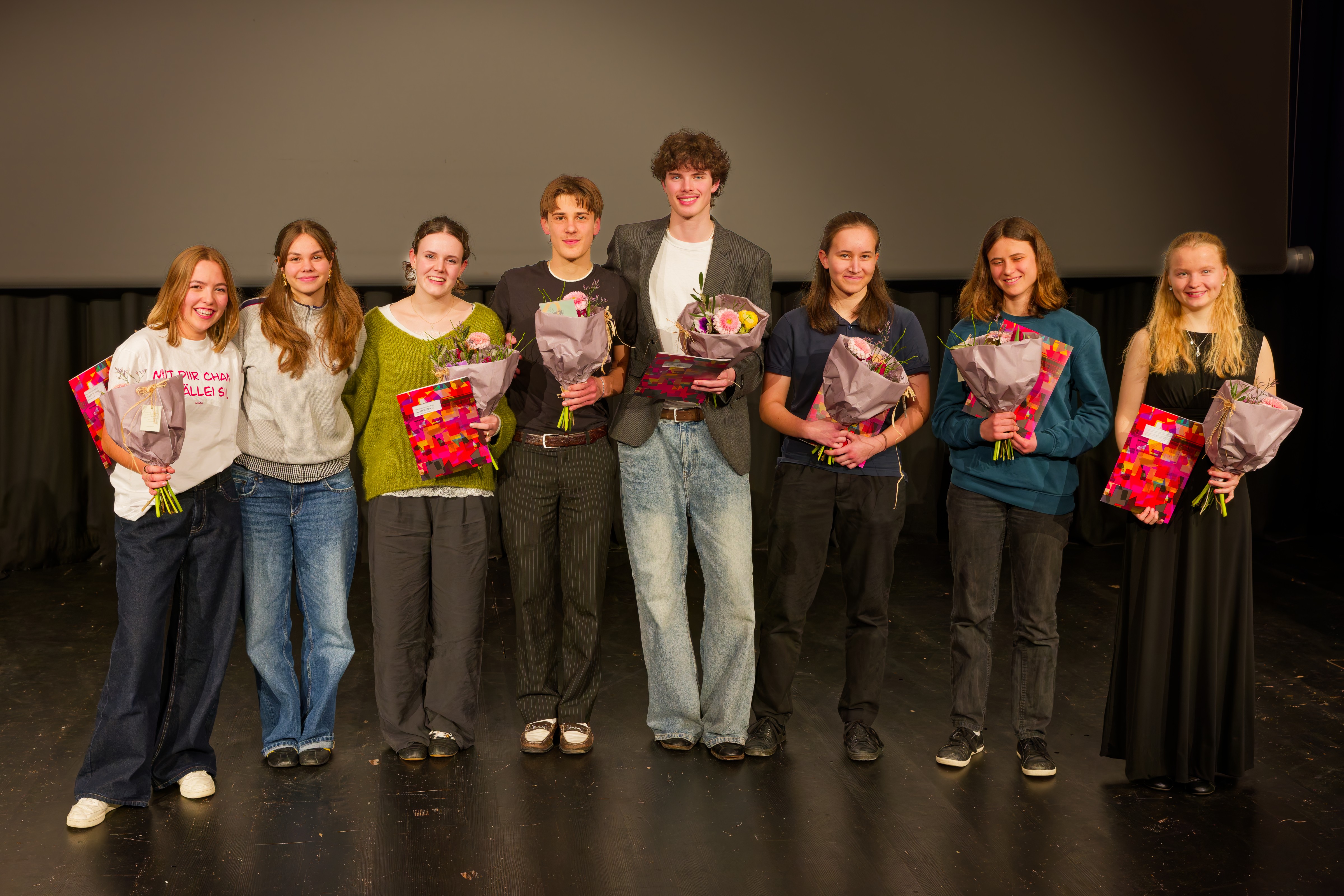 Am Dienstag, 27. Januar fand die Vernissage der diesjährigen Maturitätsarbeiten statt. Die Jury hat aus 19 nominierten Arbeiten die Arbeiten von Jara Fahrni (N6b, UNESCO-Preis), Anouk Duff (N6c), Joëlle Hartmann (M6b), Silas Winterhalter und Nicolas Frei (N6c), Mia Lampinen (AC6), Aliena Baumgartner (AC6) und Larissa Isler (AC6) ausgezeichnet (im Foto von links nach rechts).